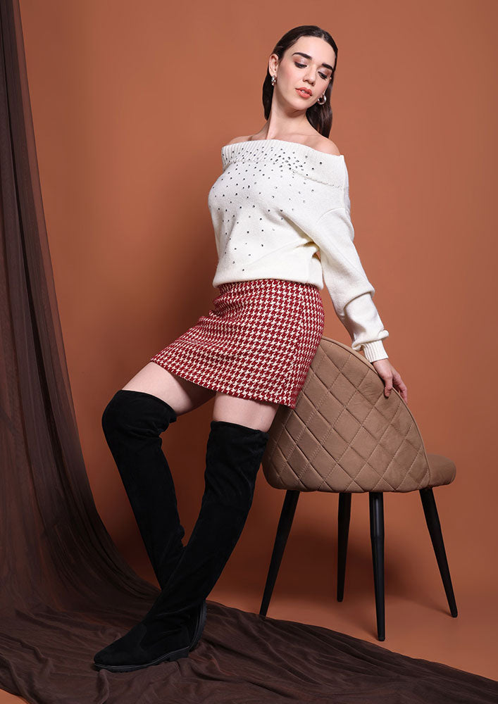 A modern statement skirt with a clean, structured silhouette. Designed in a rich red tone with a refined cream geometric pattern, this skirt blends contemporary western style with timeless appeal. Crafted in textured fabric for a polished finish, it features a concealed back zip for easy wear and a smooth, flattering fit. Perfect to style with fitted tops, blouses, or jackets for an effortlessly chic, everyday-to-evening look.