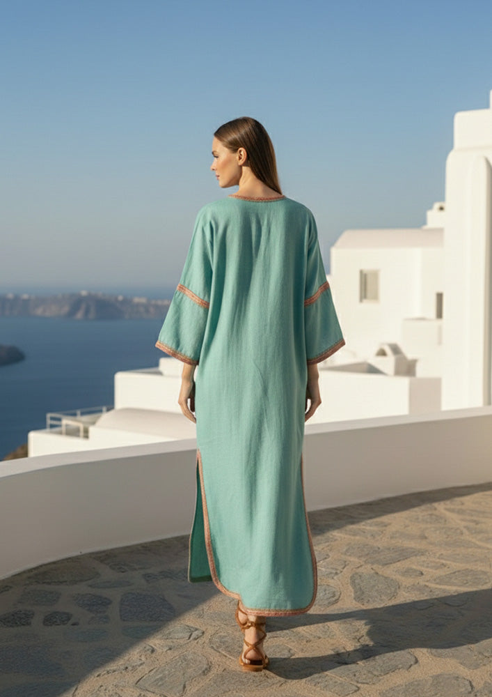 Aqua Green Linen Tribal Lace Detailed Free Flowing Kaftan Dress
