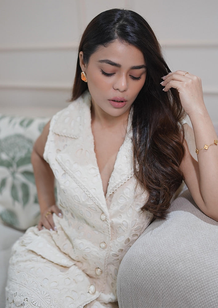 The Beige Cut-Work Vest is not just a simple garment; it features intricate designs that add a touch of elegance to your outfit. The cut-work details enhance its visual appeal, making it a standout piece for summer events. Because of its versatile design, this vest can be paired easily with various bottoms, ensuring that you look chic on every occasion.