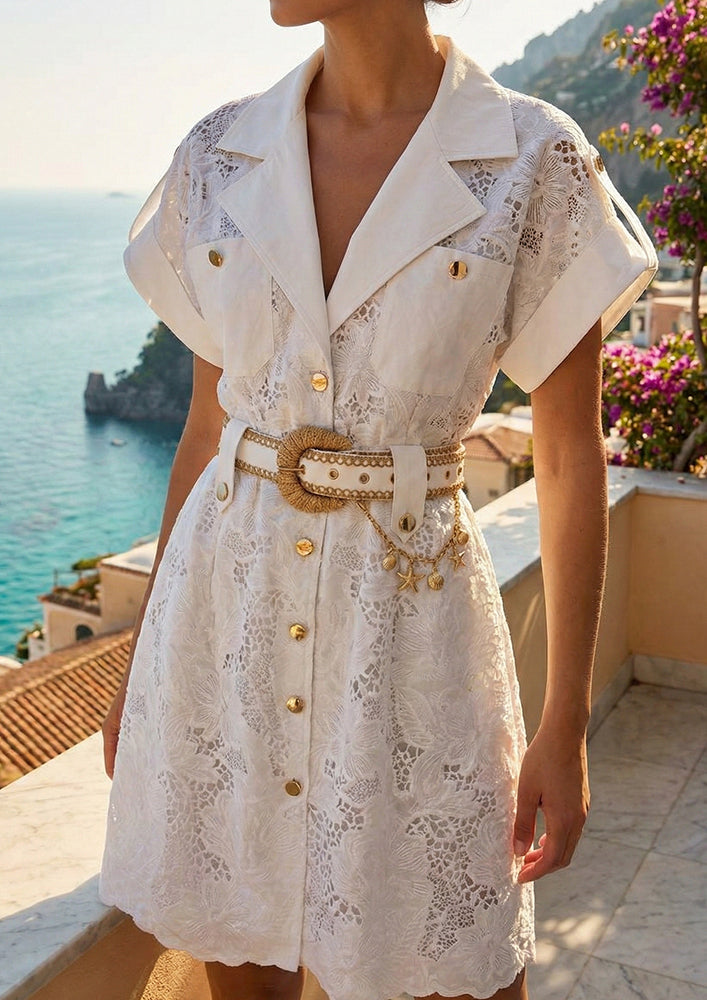 The pants are high-waisted, wide-leg trousers in a crisp white fabric. They feature a clean, tailored silhouette with a straight fall from hip to hem, creating a long, elongating look. Crafted in Denim. The length is full, grazing the floor for a refined, elegant appearance.