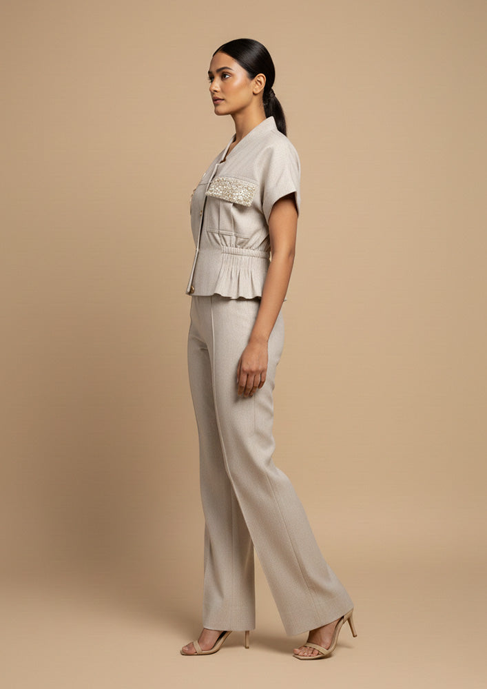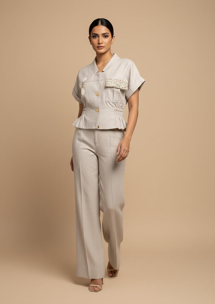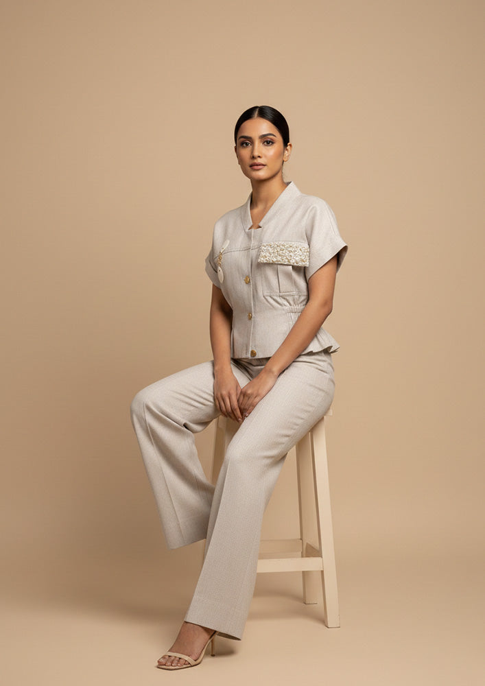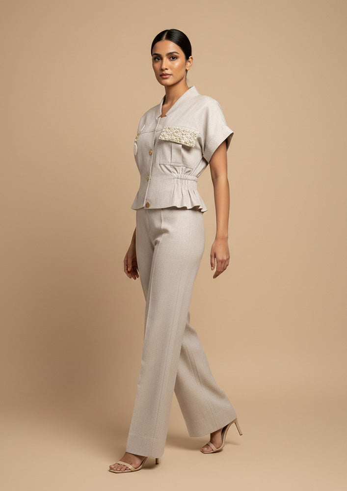 An elegant neutral-toned co-ord set crafted in a soft denim fabric. The structured short-sleeve top features a statement pearl-embellished flap pocket and subtle waist detailing that enhances the silhouette. Paired with wide-leg trousers, this ensemble offers a refined yet contemporary look—perfect for elevated daywear, brunch outings, or sophisticated casual styling.