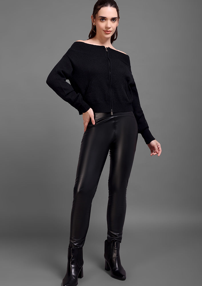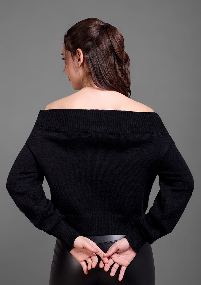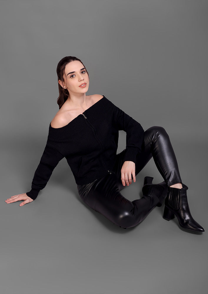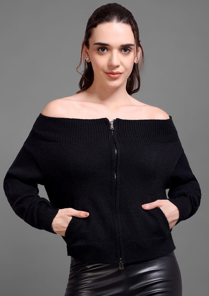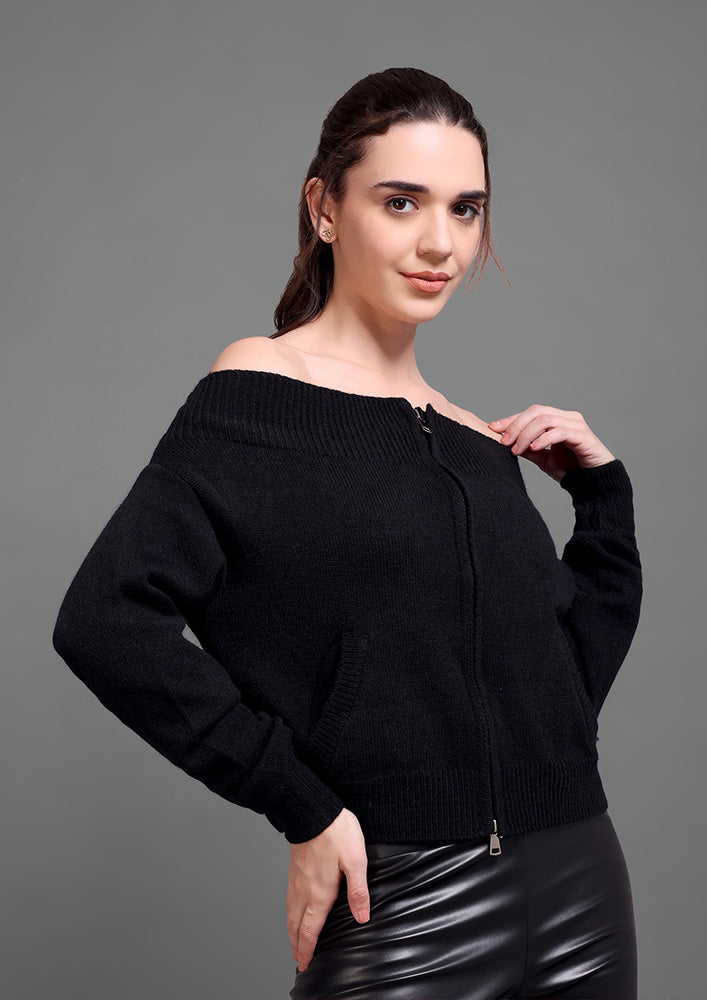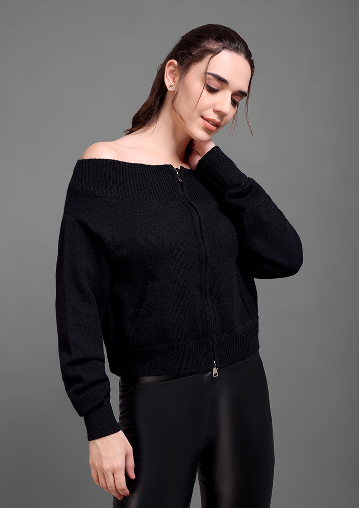 This black knitted top features an elegant off-shoulder neckline paired with a sleek front zipper for a modern, structured look. Designed with ribbed detailing on the collar, hem, and cuffs, it offers a refined finish while maintaining a comfortable fit. The front pockets add functionality without compromising style. Ideal for sophisticated casual wear or elevated winter layering.