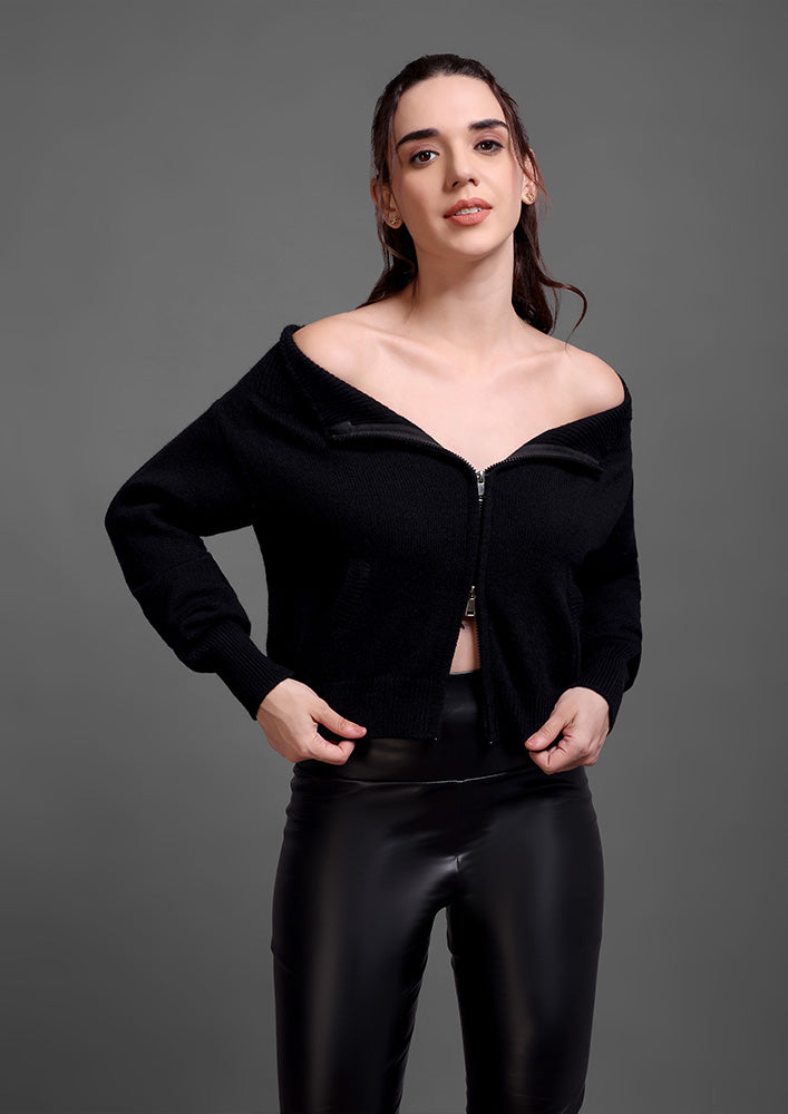 Black Off-Shoulder Knitted Zip-Up Top