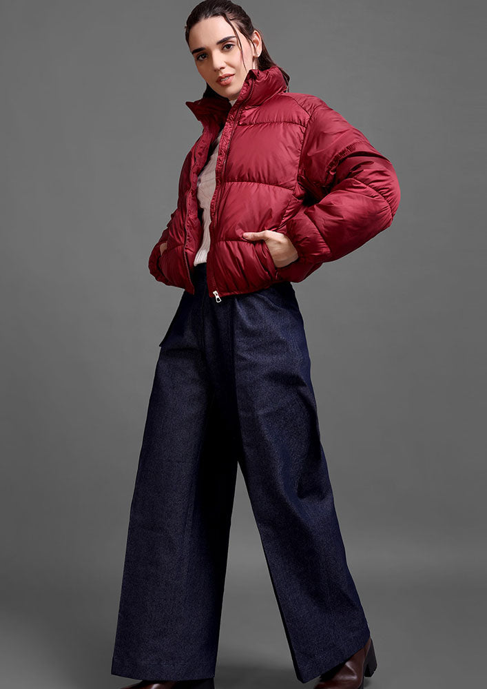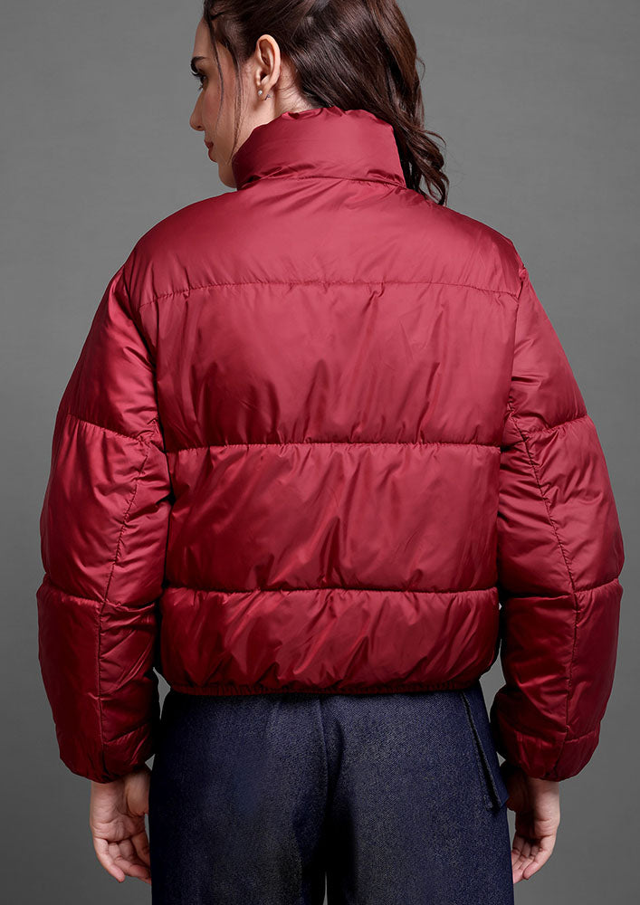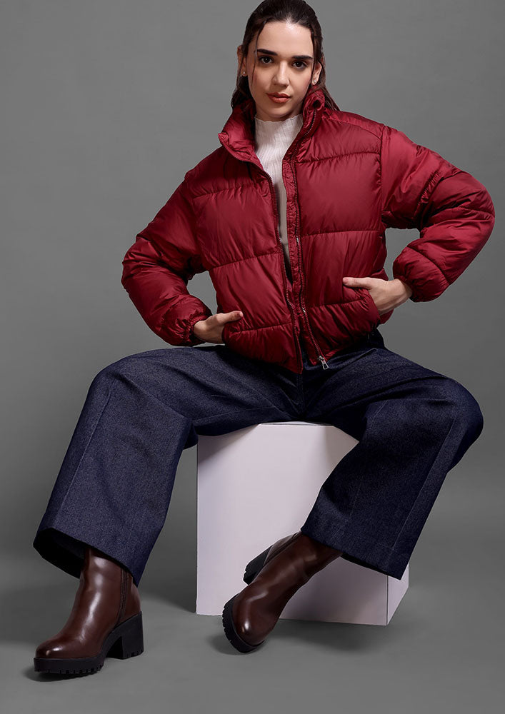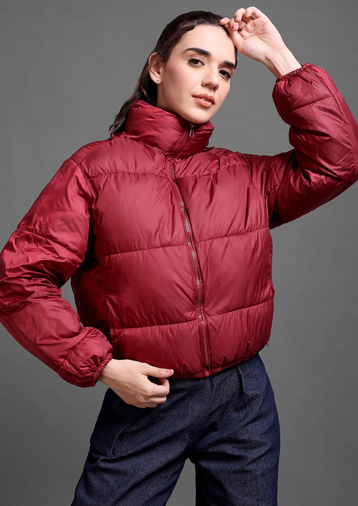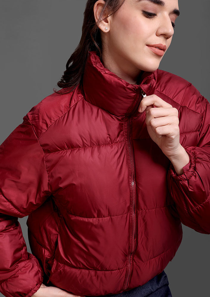 Stay warm and stylish in this chic burgundy puffer jacket featuring a sleek front zipper closure. Designed with a quilted texture for extra insulation, it offers both comfort and a trendy street-style vibe. The rich burgundy hue adds a touch of sophistication, while the lightweight yet cozy feel makes it perfect for chilly days. Pair it with jeans or joggers for a effortlessly cool winter look.