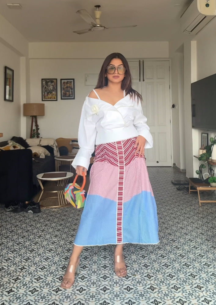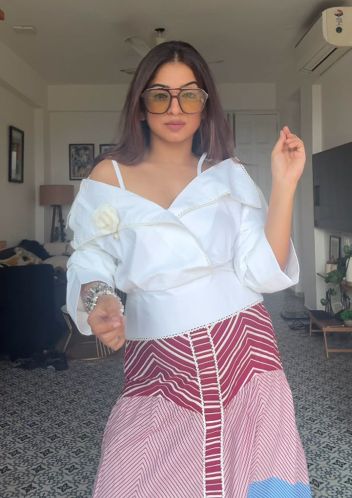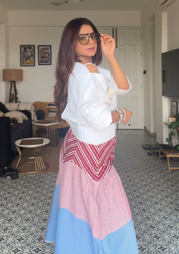 Embrace the refreshing charm of this top and Skirt set. Perfect for summers. This ensemble exudes playfulness and charm. Whether it's a tropical getaway or a summer gathering. Top has lace detailing's and skirt features multi stripe 3 panels A-line silhouette. Pair it with white flats and pumps.