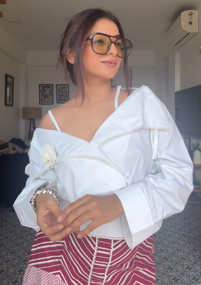🤍 Elegant White Peplum Top Design :-Crafted in a clean white shade, the peplum top features a flattering silhouette that enhances the waist while adding a soft, feminine charm to the overall look.