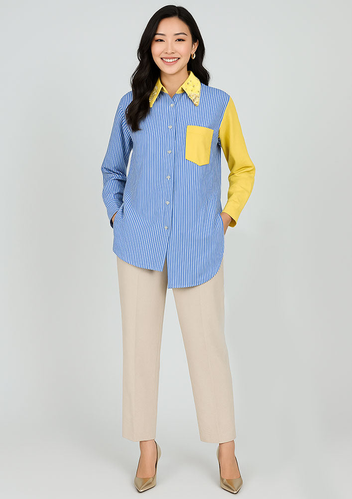 Blue Striped Shirt with Pearl Embellished Collar & Buttons