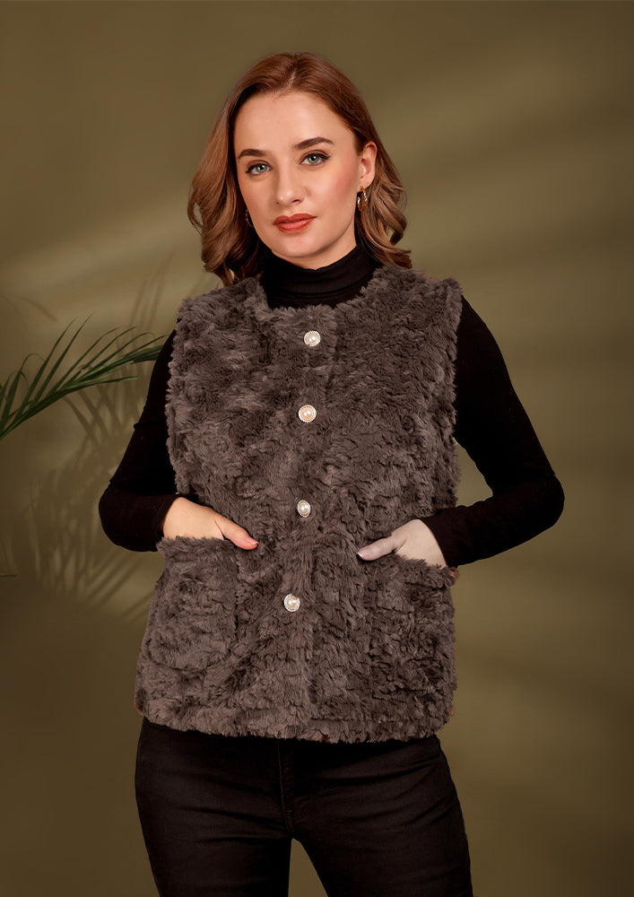 Brown Woolen Fur Sleeveless Vest