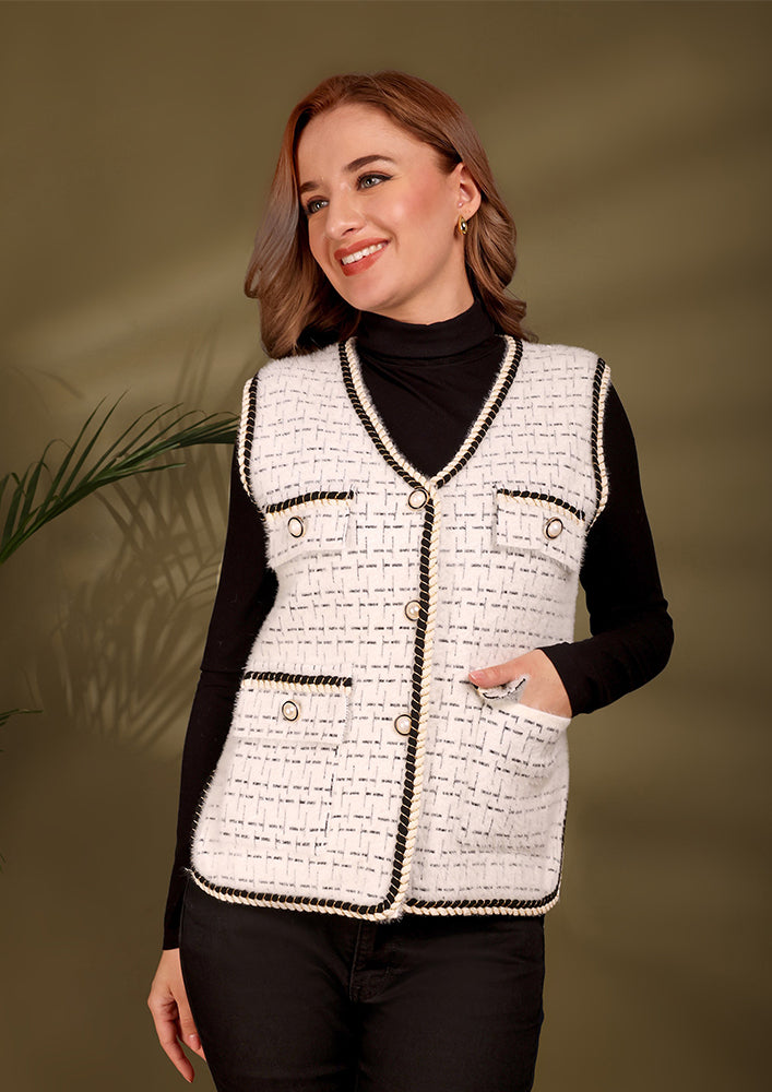 White Sleeveless Textured Tweed Jacket